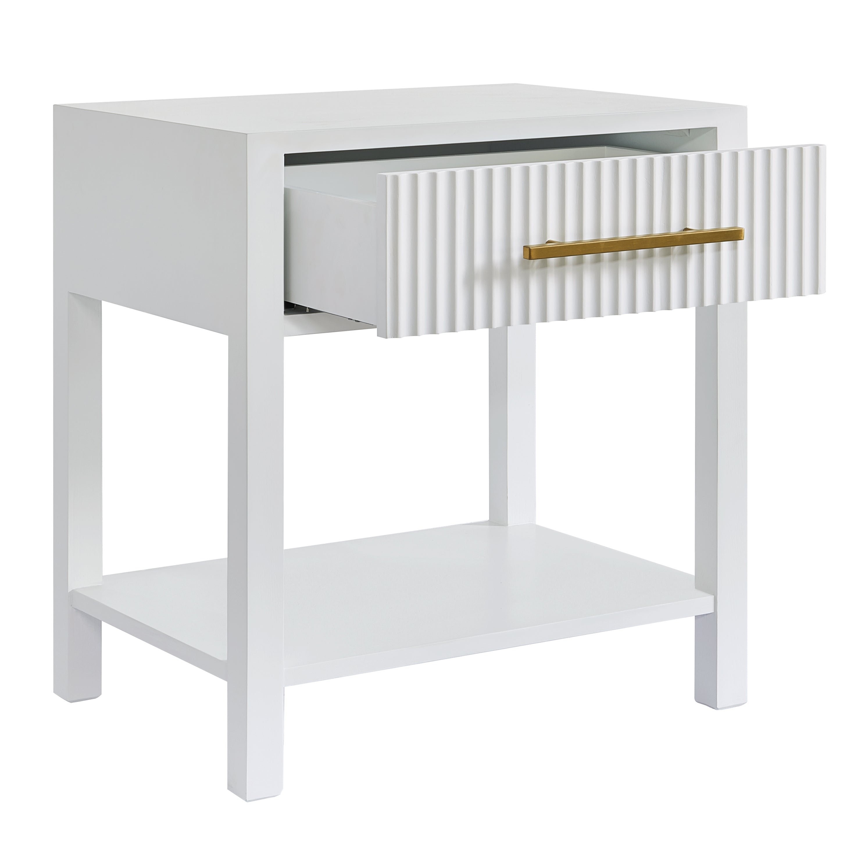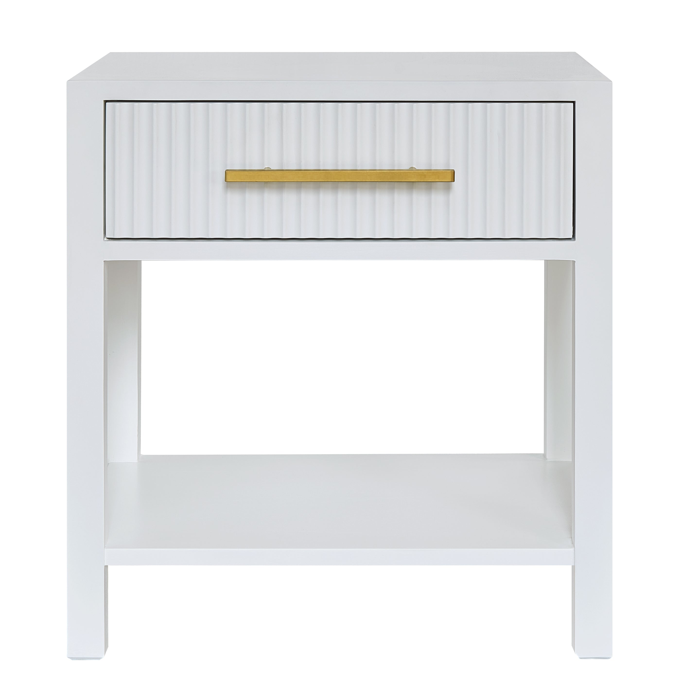 1 Drawer Bedside Table features a fluted ash timber veneer finish with brass handle, open shelf and smooth metal runners. Fully assembled.