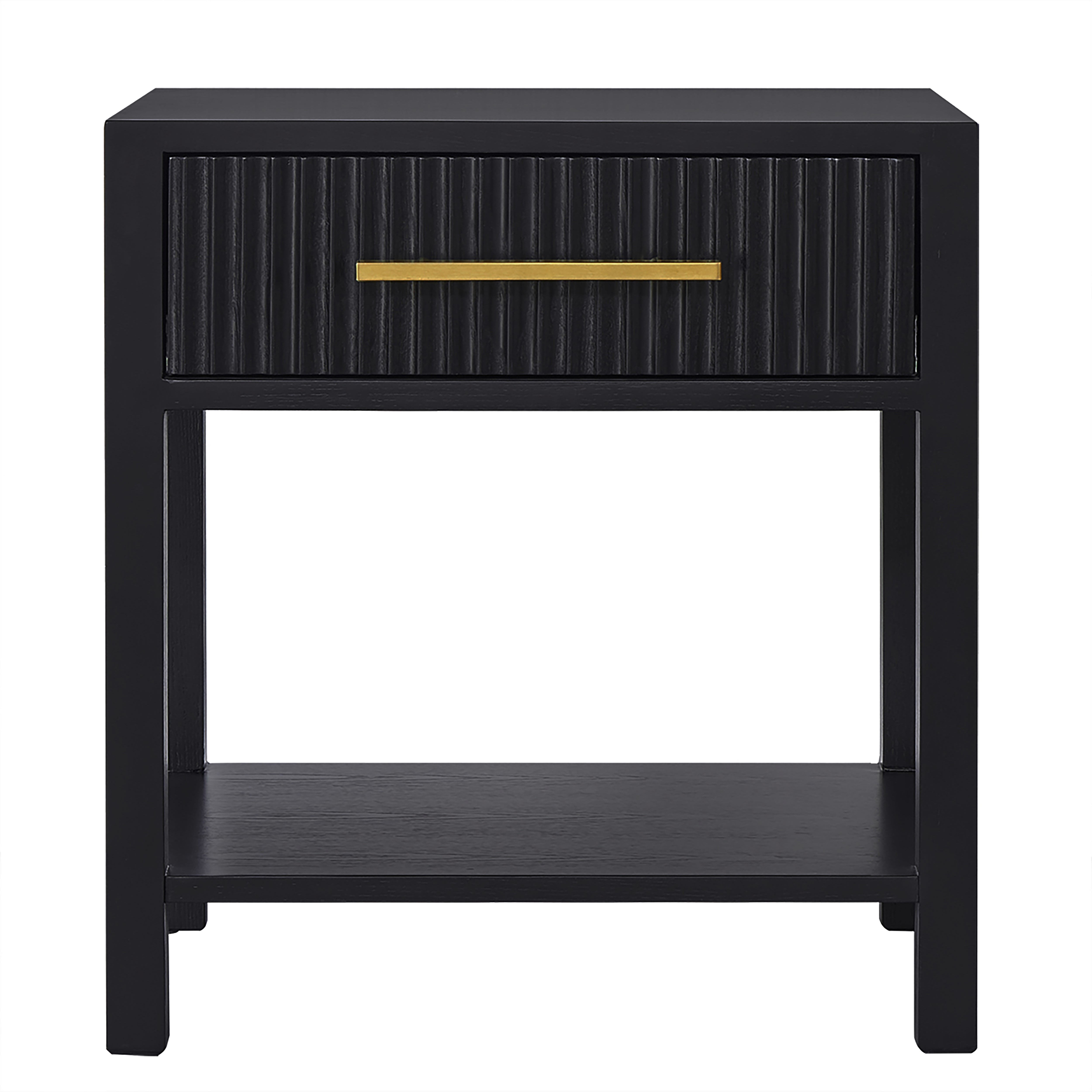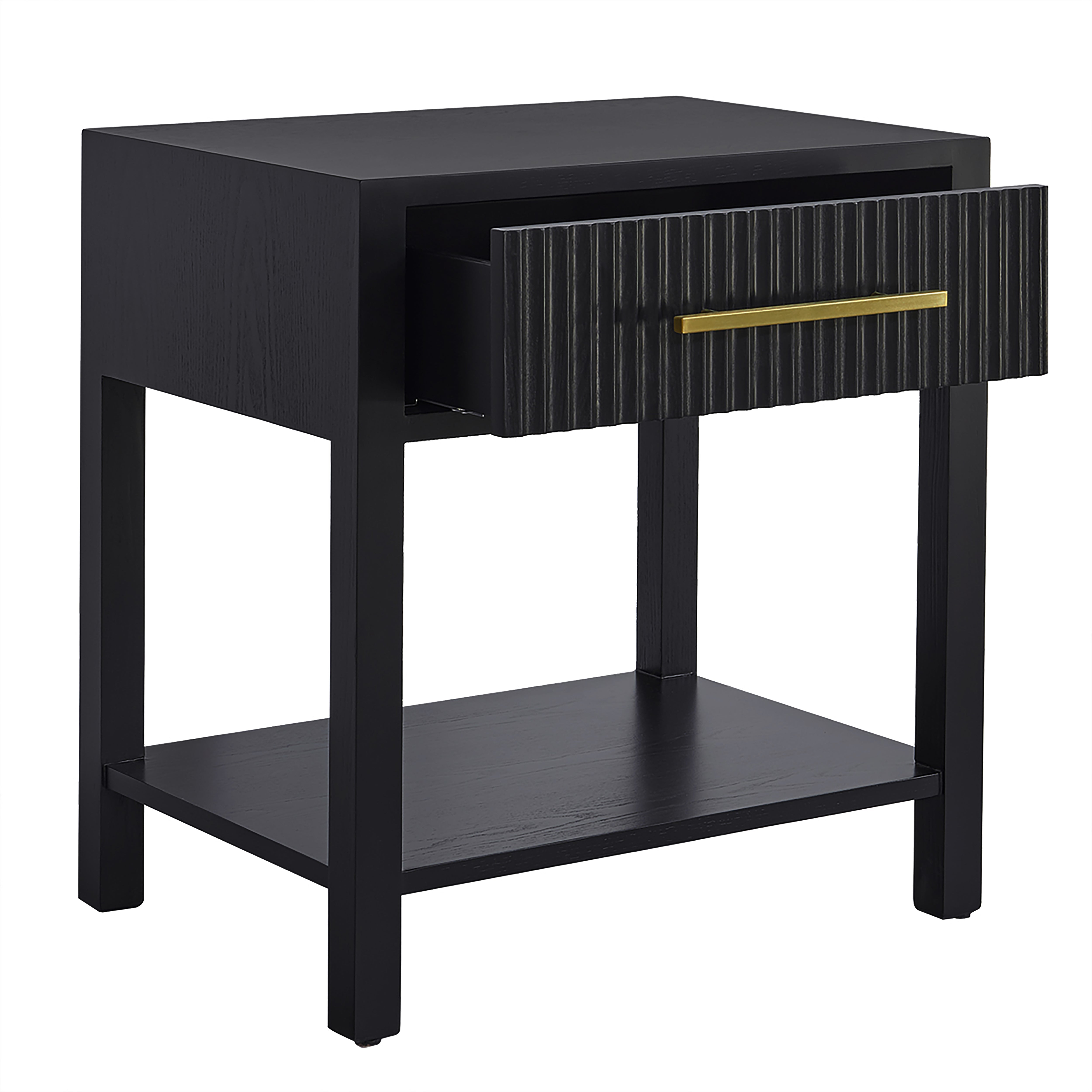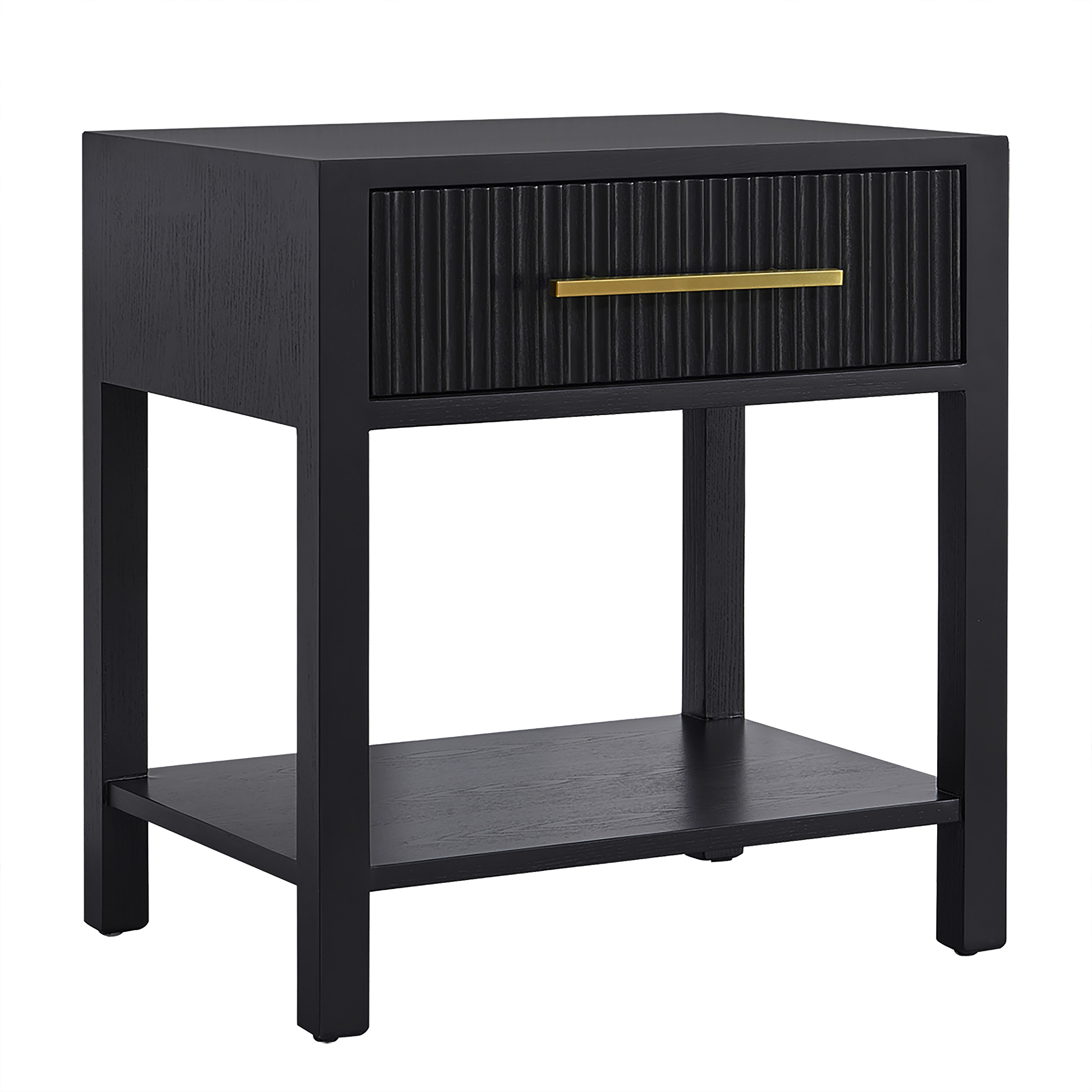 1 Drawer Bedside Table features a fluted ash timber veneer finish with brass handle, open shelf and smooth metal runners. Fully assembled.