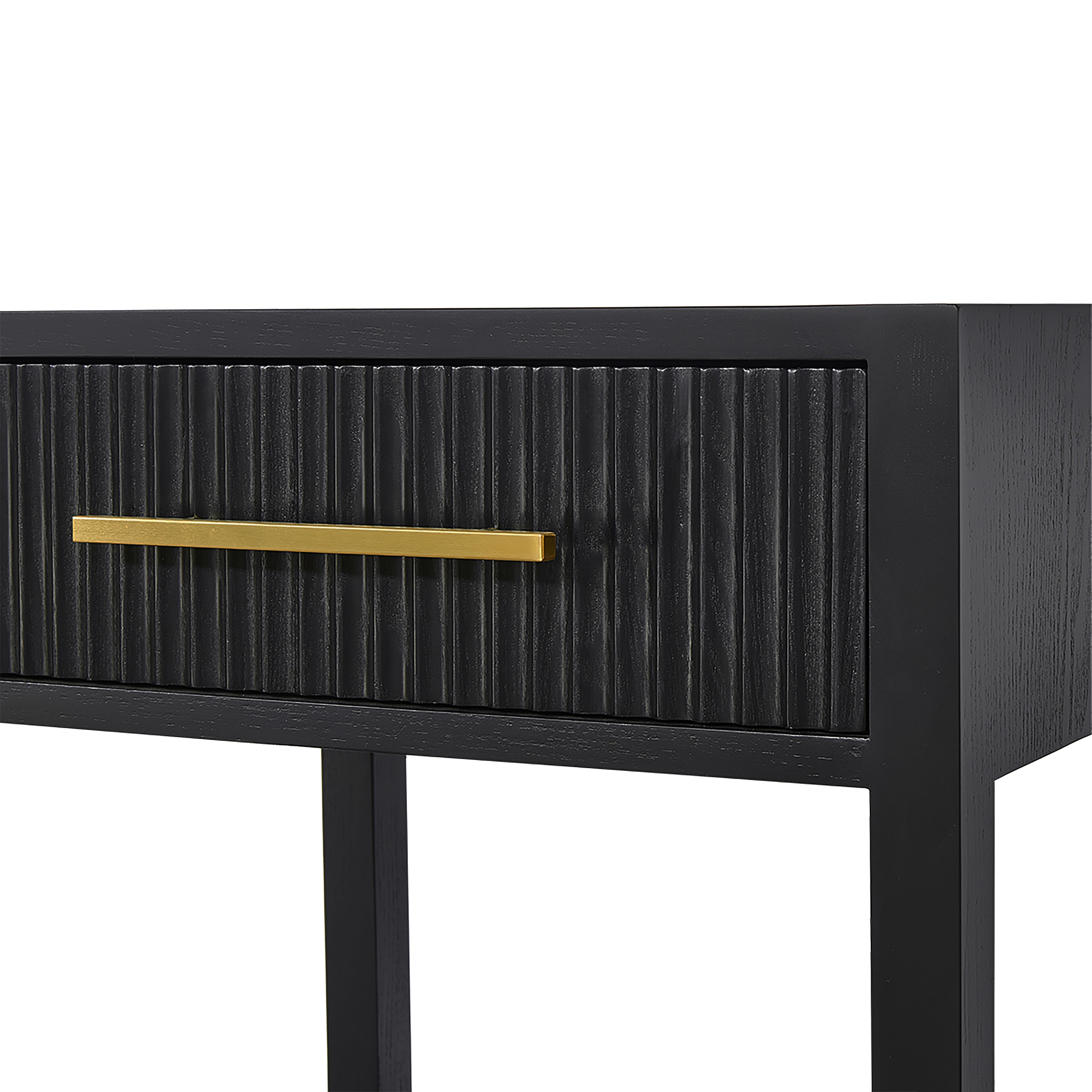 The Mayfair 1 -Drawer Bedside Table with a shelve, blends contemporary elegance with coastal appeal, featuring an ash timber veneer finish and a fluted drawer design for added texture. Sleek brass handles contrast beautifully, while smooth metal runners ensure effortless functionality. Its three spacious drawers provide ample storage, making it a practical yet sophisticated addition to any bedroom. Available in black or white and also offered in a 1 or 3 drawer bedside, 6-drawer chest, or buffet to complete the collection.