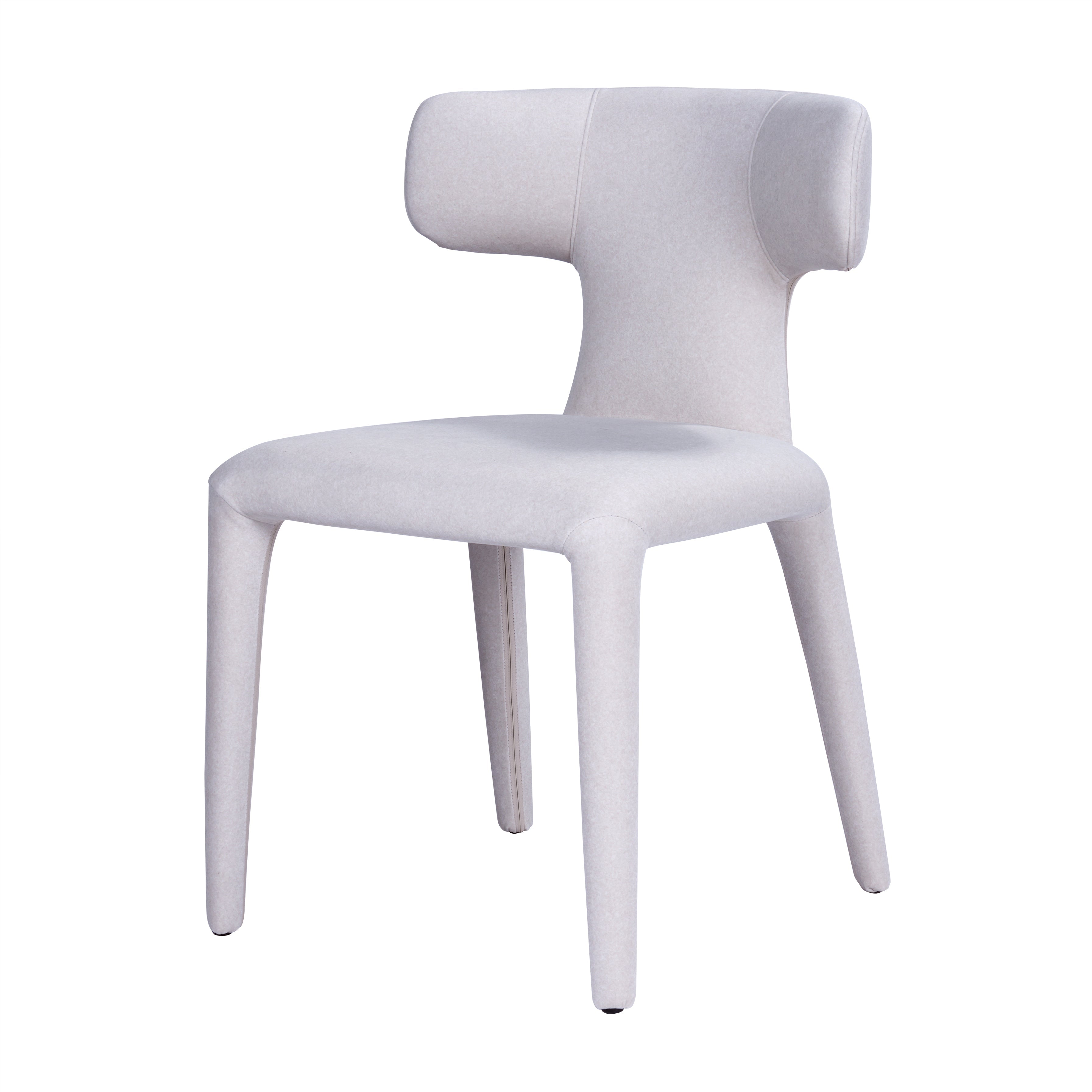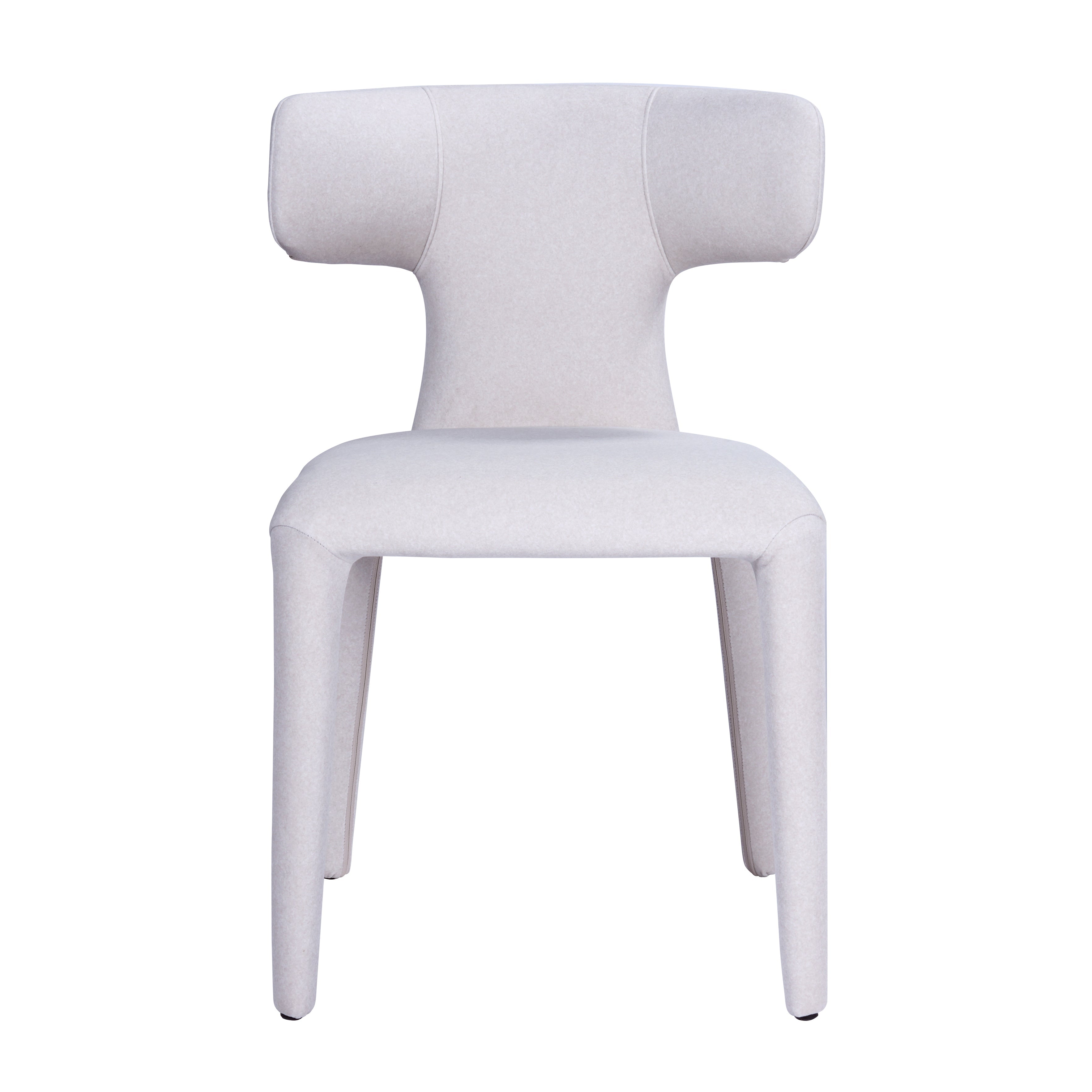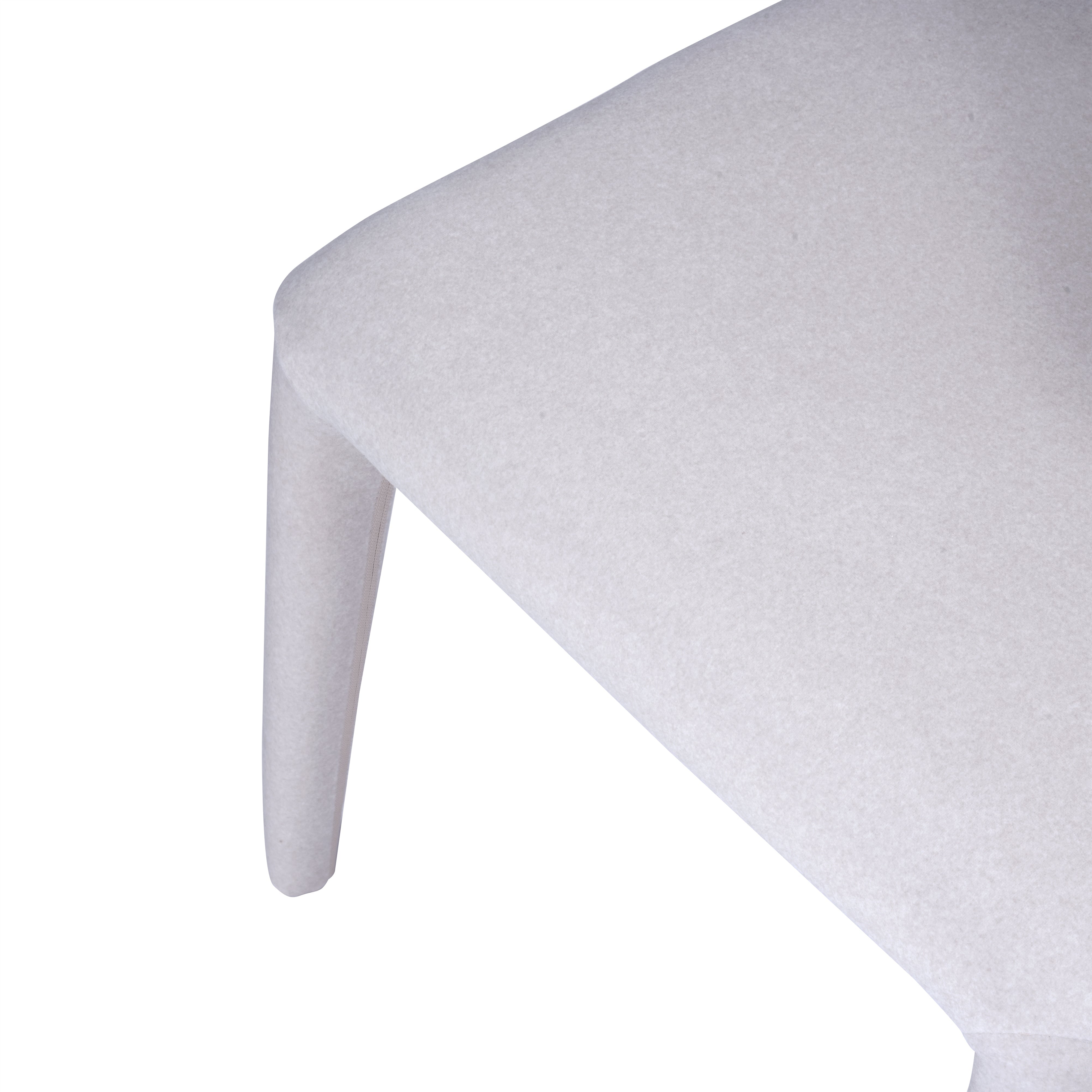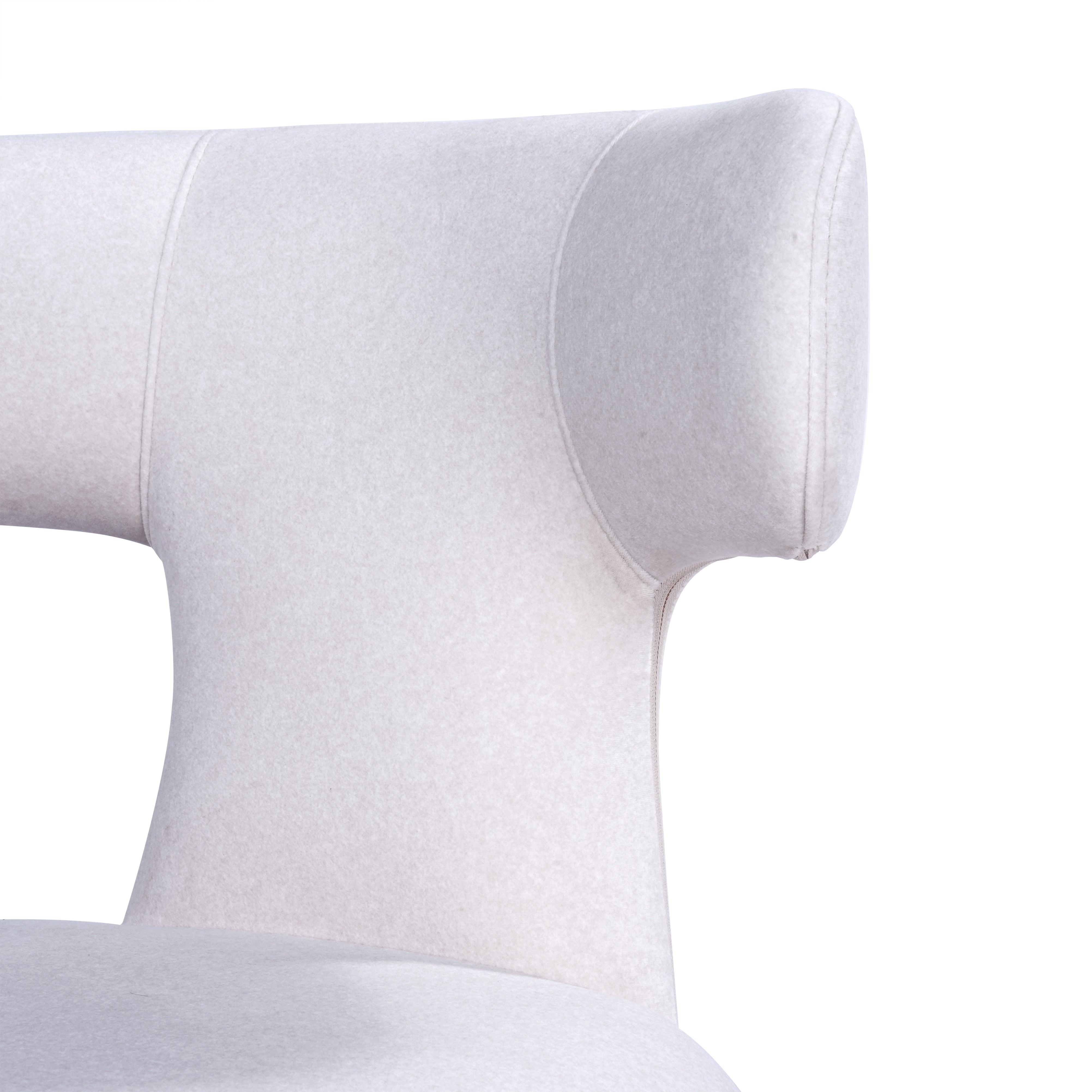 Upholstered in a felt like velvet fabric, features a sculptural curved backrest. Foam seating with strapping. Built with a steel frame and legs and upholstered in the same fabric.. Fully assembled.