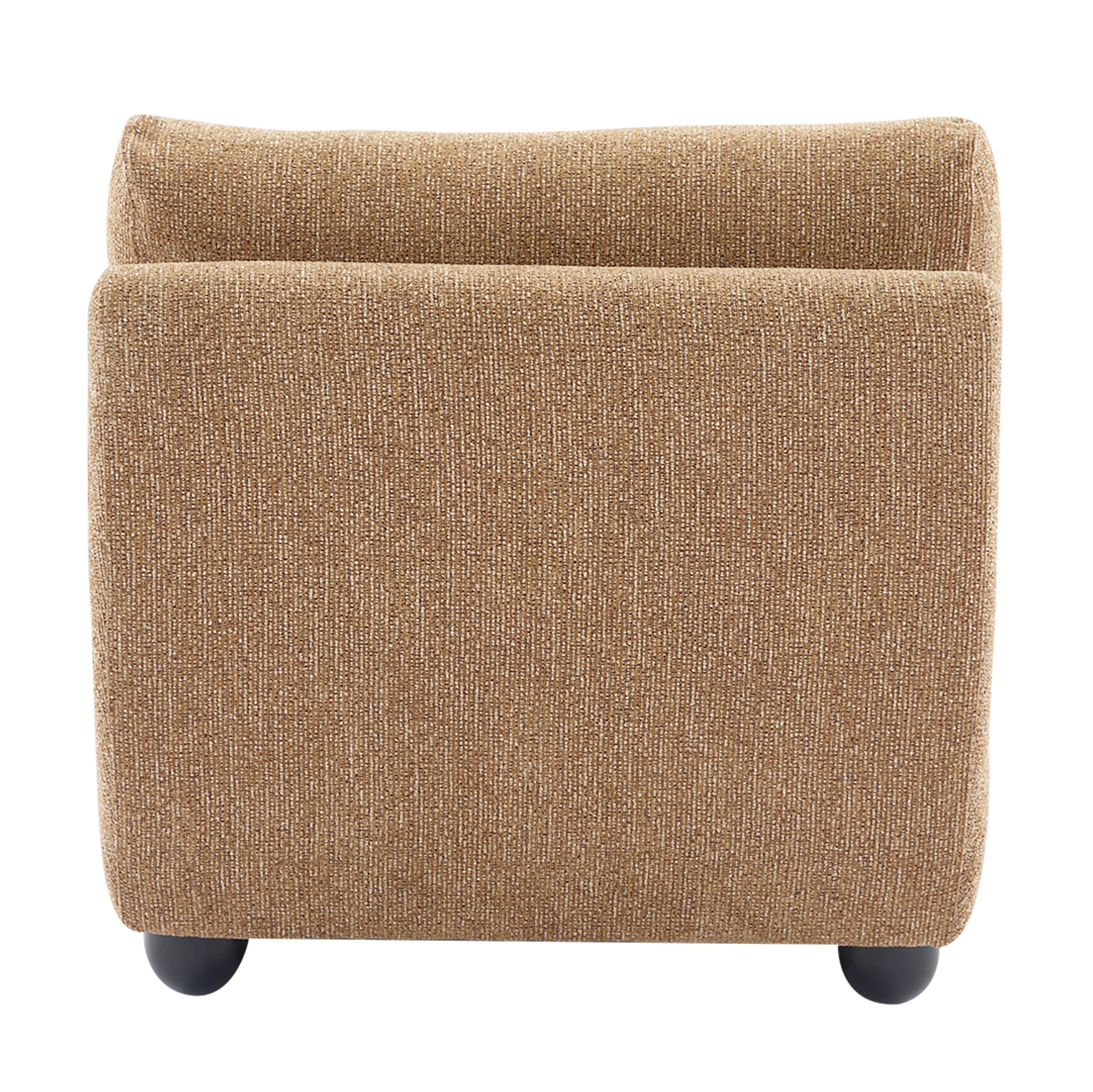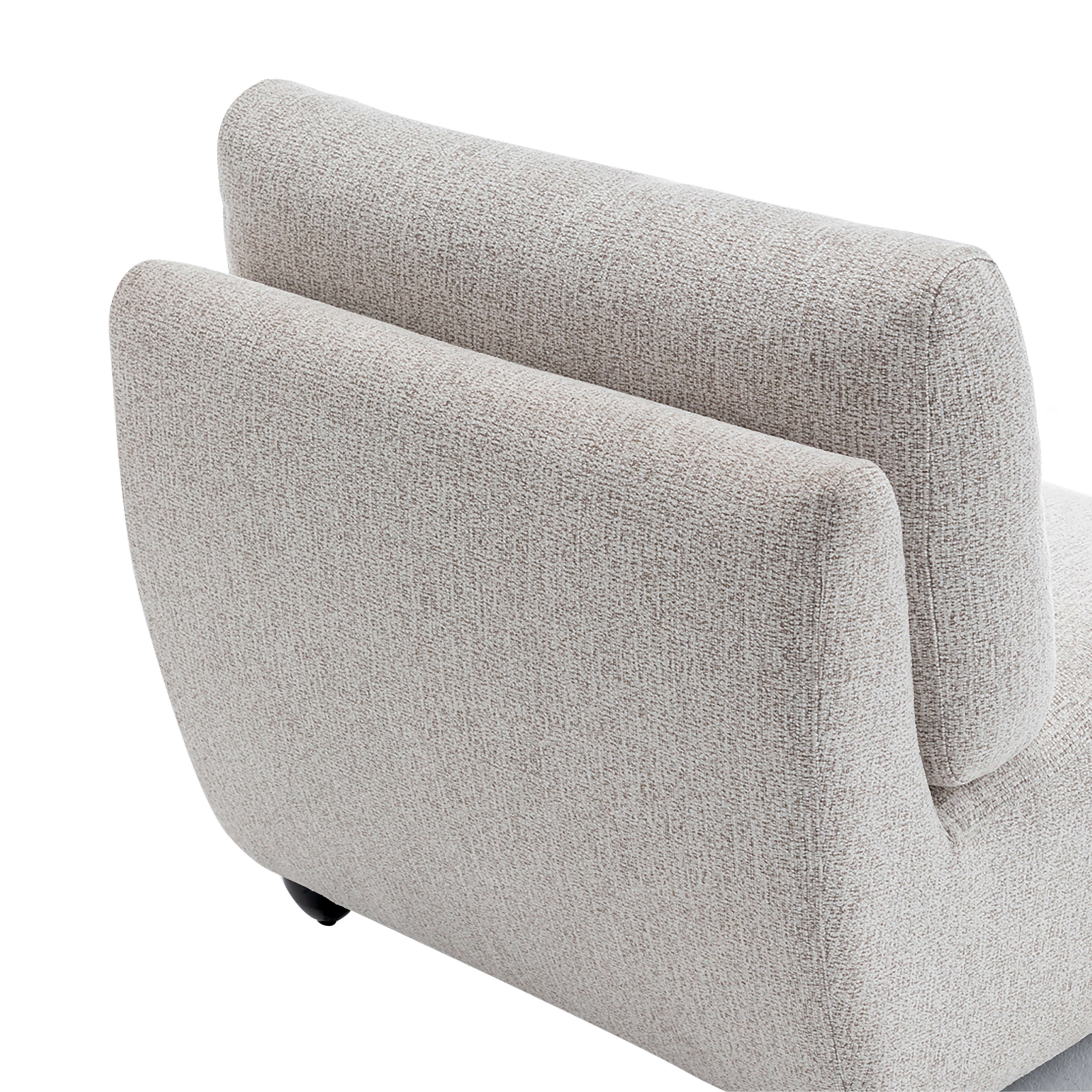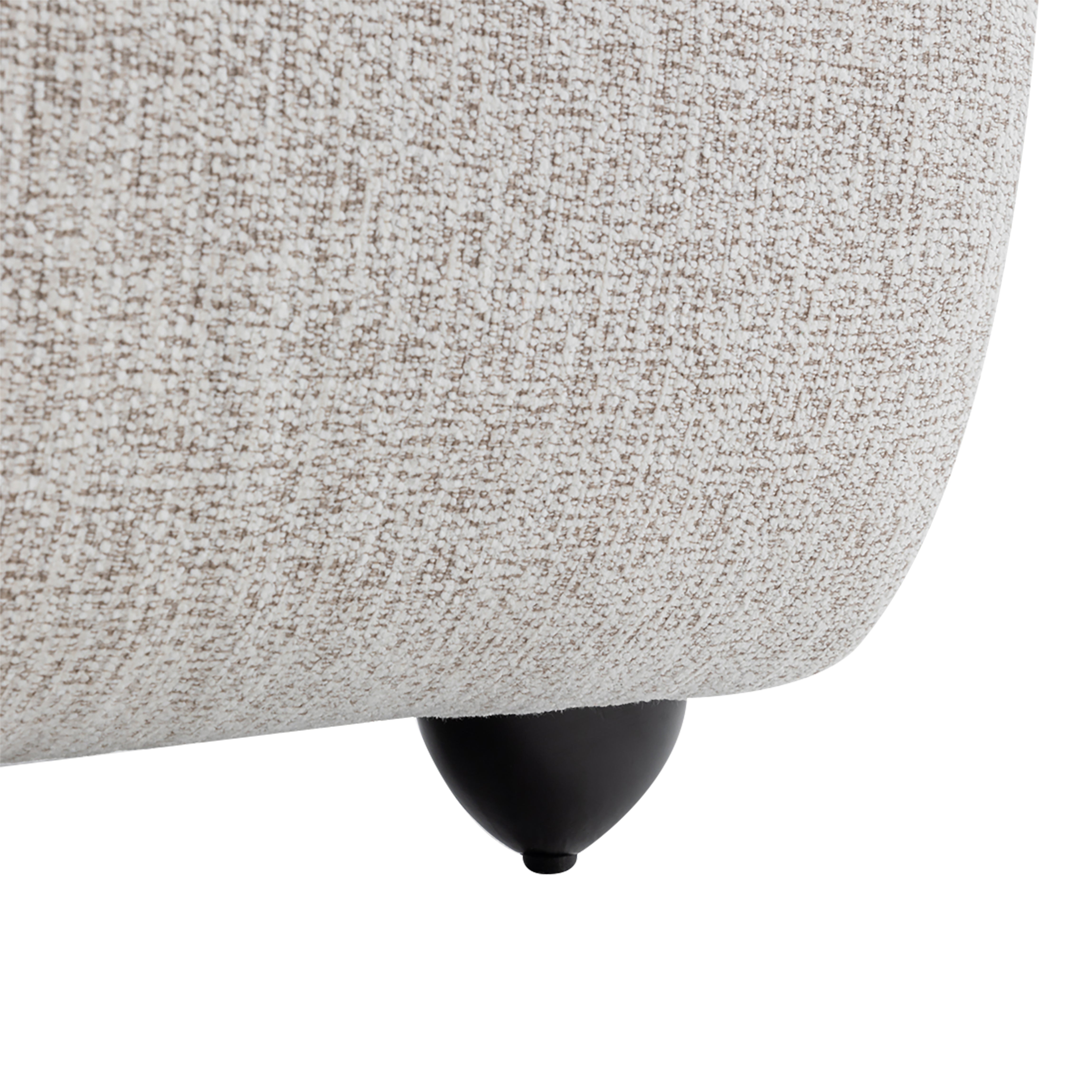 Solid hardwood frame with loose foam cushion seat and back. Upholstered in textured chenille fabric with black timber ball feet. Legs to be assembled.
