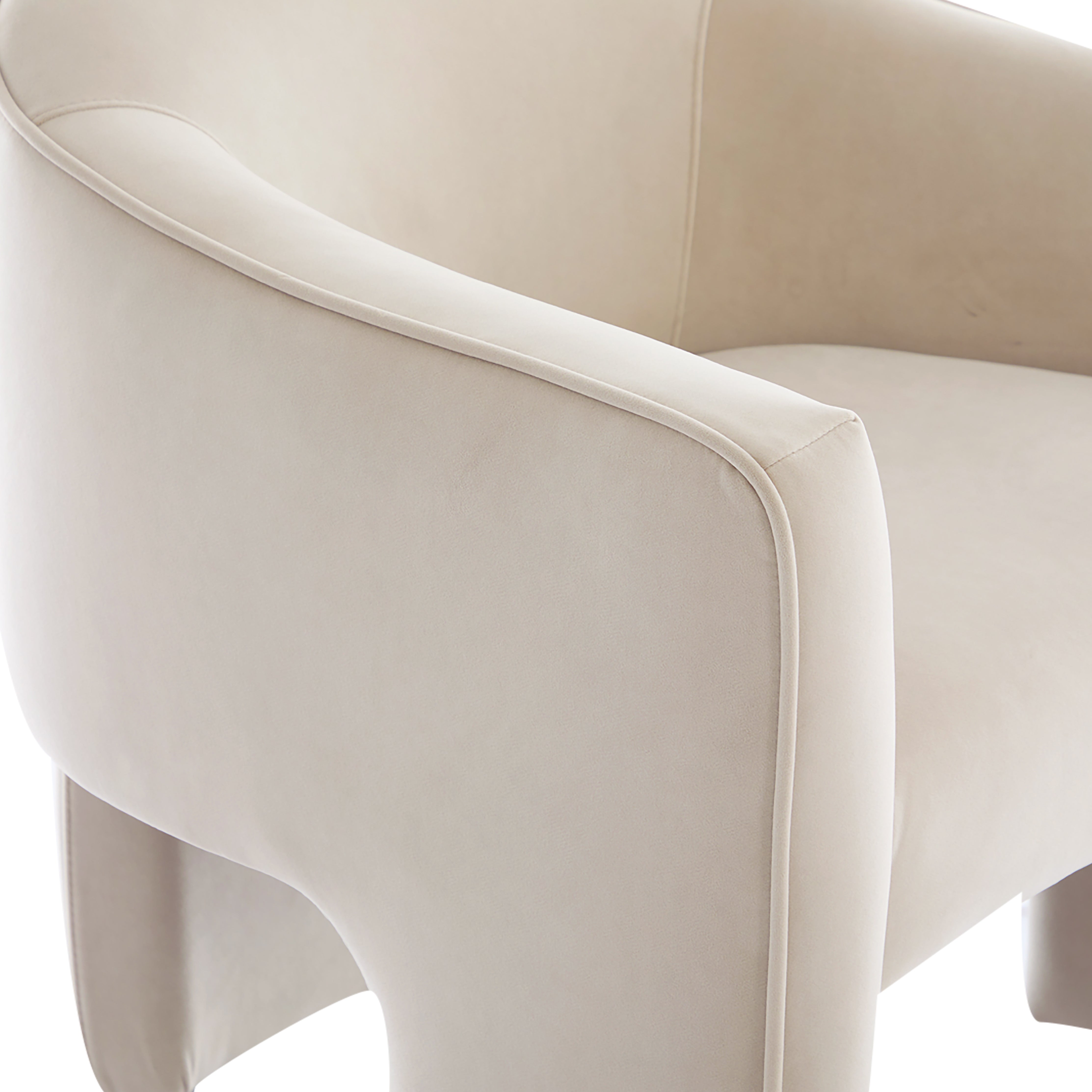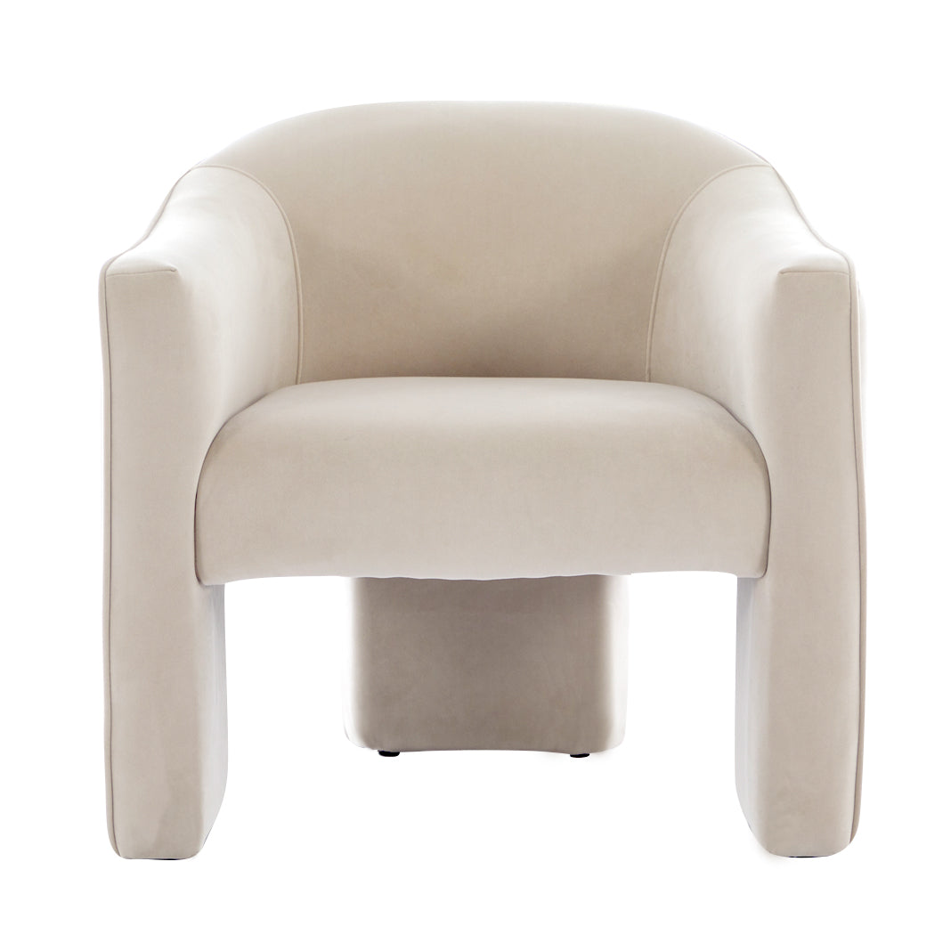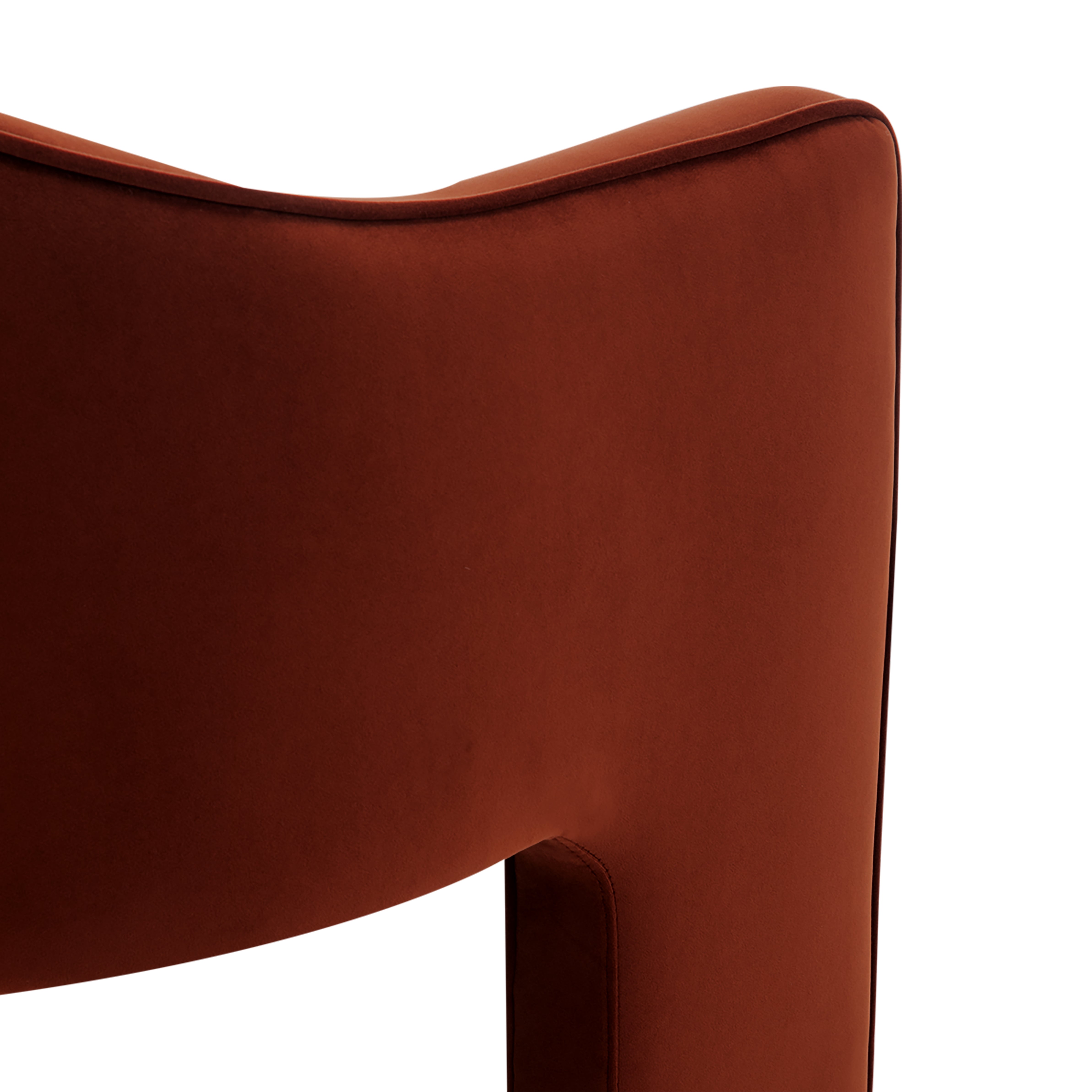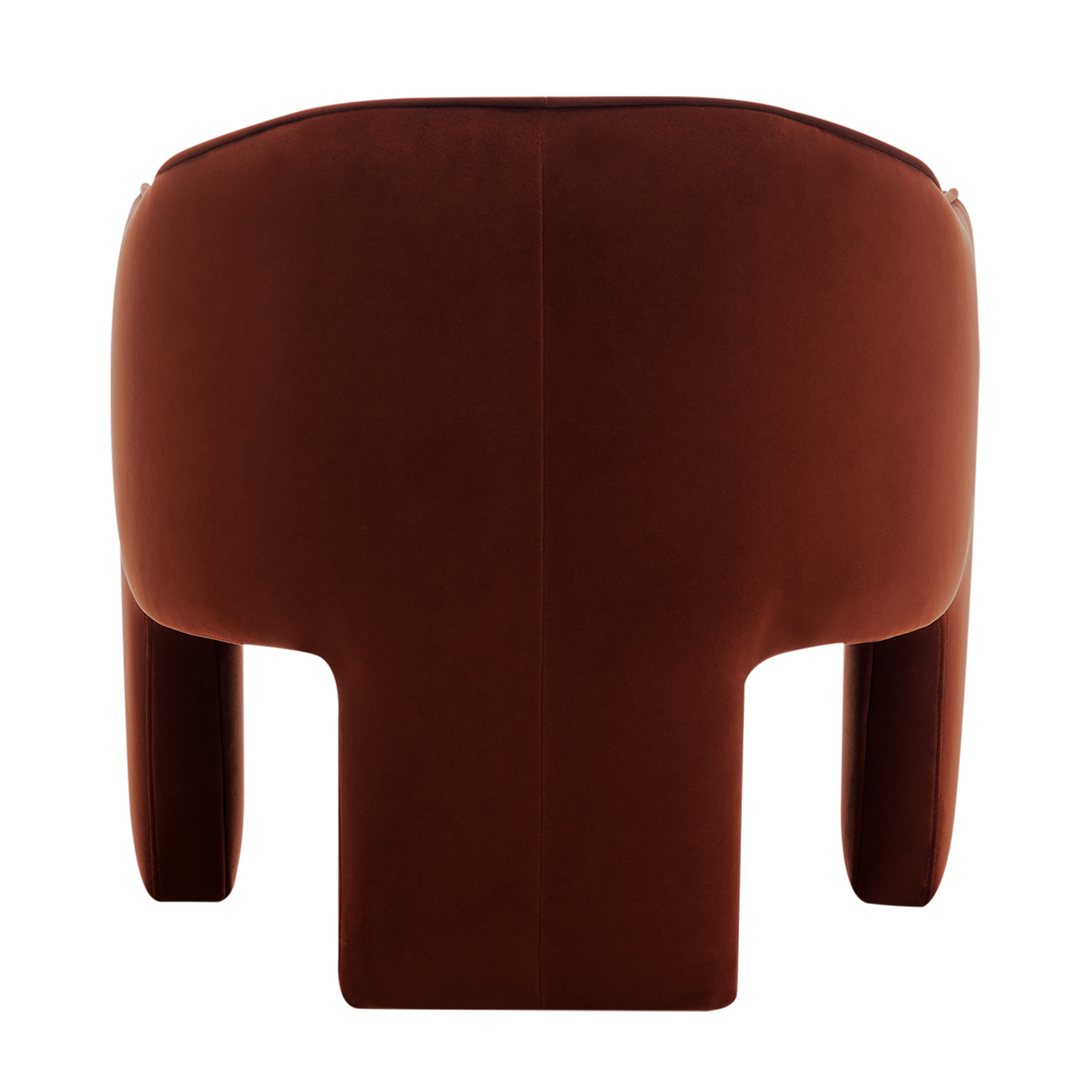 Constructed with a solid hardwood frame and supported by webbing and and foam cushioning. Upholstered in soft velvet. Its bold silhouette and sculptural lines add a refined statement. Fully assembled.